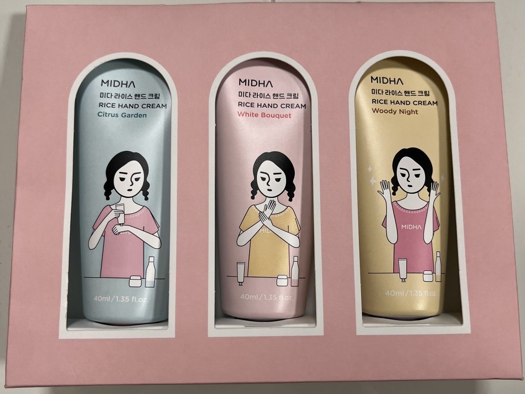 - Hydratace a výživa: krémy jsou obohacené o extrakty z rýže a dalších obilnin (např. fermentovaná rýže, ovesný extrakt a ovesná mouka), které pomáhají pečovat o suchou pokožku rukou.